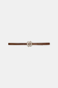 The thin pebbled leather belt has a D-rose buckle and adjustable push stud closure. Material & Care - 100 % Leather (calf) - Belt with D-rose buckle - Calfskin pebbled outside and smooth lining - Vintage icy gold-tone buckle - Tonal painted edges Size & Fit - Width: 2 cm - Size measurement taken from middle hole to buckle pin