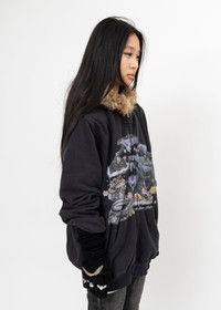 Faux fur collar detailed Graphic picture on chest Two pockets on side Distressed black color Regular fit 100% Cotton Made in Japan Model is wearing a size M Model is 5'6" (168 cm), 98 pounds (44kg), usually wears S in tops. A size 25 in denim and S in trousers. Size 7 in shoe size. *FINAL SALE*