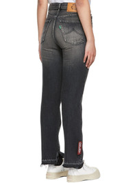 Straight-leg non-stretch recycled denim jeans in black featuring fading and whiskering throughout. · High-rise · Five-pocket styling · Belt loops at waistband · Leather logo patch in tan at back waistband · Button-fly · Textile logo patch in red at cuff · Distressing at cuffs · Copper-tone hardware Supplier color: Black 100% recycled cotton. Made in Japan 221038F069001
