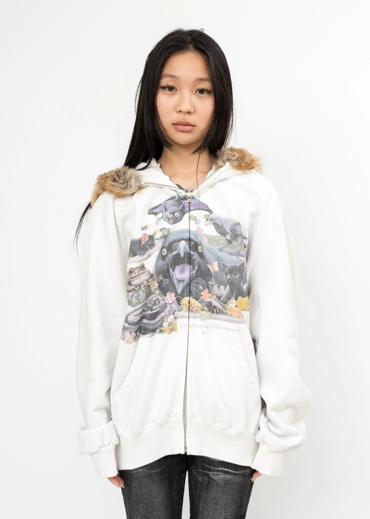 Faux fur collar detailed Graphic picture on chest Two pockets on side Distressed black color Regular fit 100% Cotton Made in Japan Model is wearing a size M Model is 5'6" (168 cm), 98 pounds (44kg), usually wears S in tops. A size 25 in denim and S in trousers. Size 7 in shoe size. *FINAL SALE*