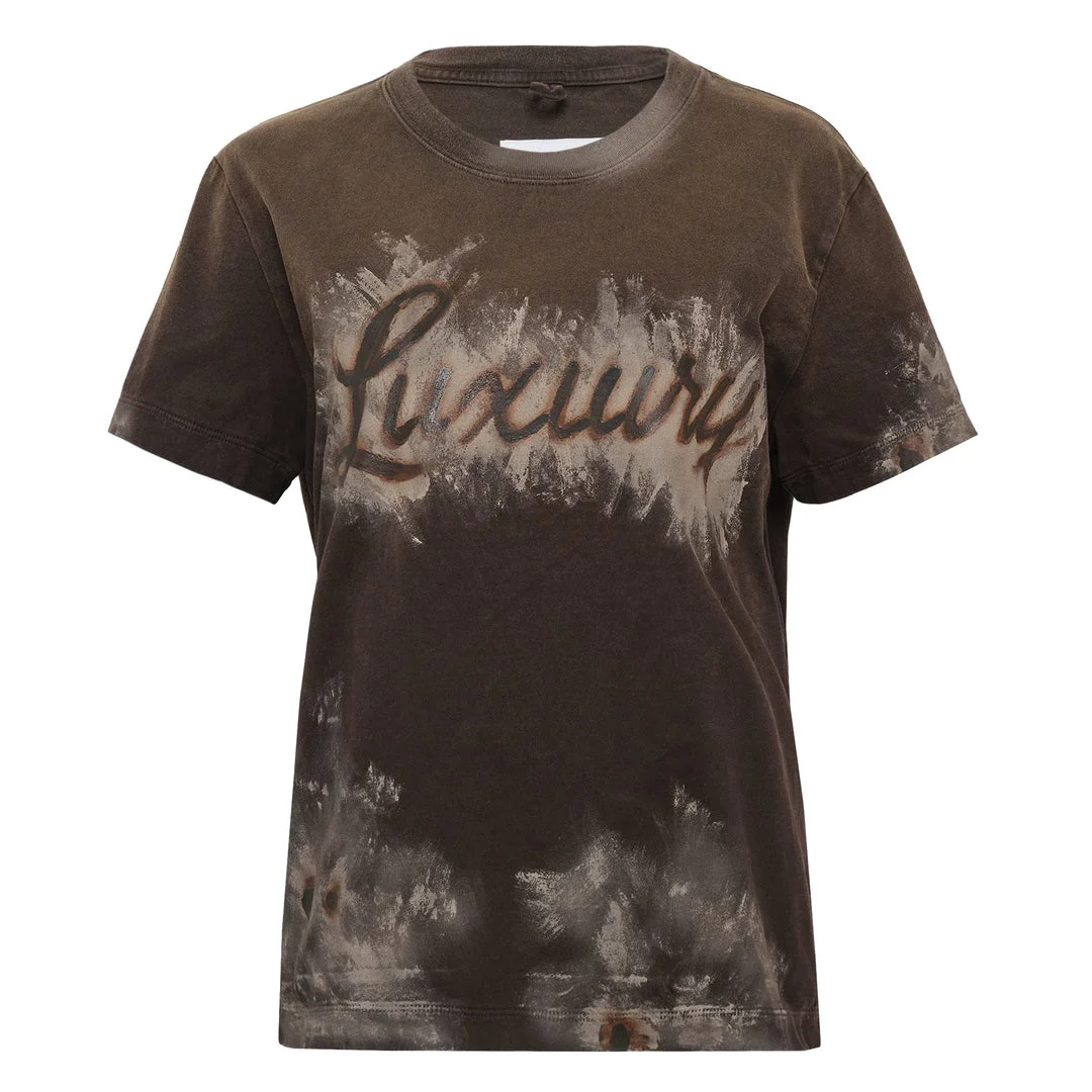 600081688BRN00L / 26SS40CS434/00/BROWN - Hand-applied mud paint effect - Bleach treatment detailing - Distressed vintage finish - Script logo print - Premium cotton construction - Regular fit - Round neckline - Short sleeves The doublet Luxury Mud Paint T-Shirt delivers avant-garde streetwear with artistic distressed detailing and contemporary Japanese design. Crafted from premium cotton with hand-applied mud paint effect and bleach treatment creating unique worn-in texture. The distressed aesthetic and signature doublet craftsmanship create a statement piece that bridges art and fashion.