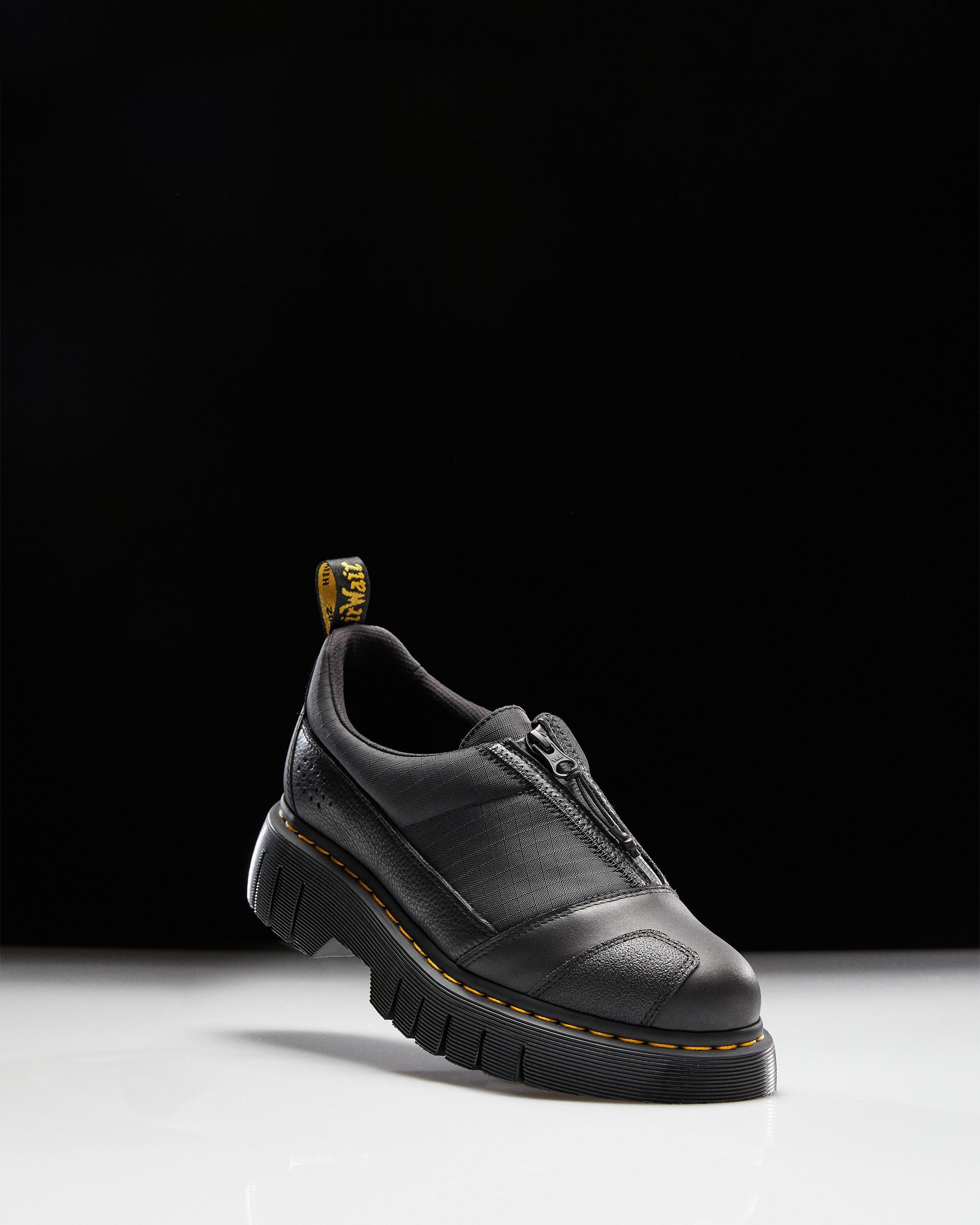 A new era begins. The 1461 shoe reworked and reimagined. An experiment that questions the nature of our traditional silhouettes and recontextualizes our industrial design history through a modernist lens. The 1461 form has been distorted and reconfigured replacing the standard lacing system with an AquaGuard zip enclosure. The upper is constructed from contrasting material panels to create textural contradictions. The construction prioritizes soft, full-grain Lunar leather for flexibility and durability. With hardwearing Sorento leather and flexible, tear-resistant Cosmo Hub Ripstop panels. Finished with scuff and water-resistant TecTuff rubber-grained leather across the toe and a molded rubber bisecting the heel. The shoe is set on our new Clubwedge outsole with exaggerated cleats and rugged aesthetic complimented with a cushioned SoftWair innersole. Each pair is marked as true Dr. Martens with a yellow welt stitch and AirWair heel loop. DM’s history colliding with an unknown future. Construction Goodyear Welted - the upper and sole are heat-sealed and sewn together, providing more comfort and durability for years to come. Product code 31796001
