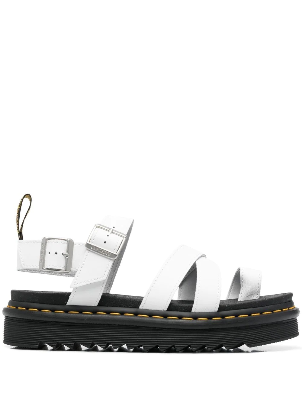 Avery Hydro platform sandals from DR. MARTENS featuring white, black, calf leather, square toe, open toe, contrast stitching, crossover strap at the toe, buckle-fastening ankle strap, logo pull-tab at the heel, silver-tone hardware and platform sole. Imported Composition lining: Calf Leather 100%,Rubber 100% outer: Calf Leather 100% sole: Rubber 100% Product measurements for size: 6 (UK) Heel: 5 cm (2 in) Platform: 4 cm (1.6 in)
