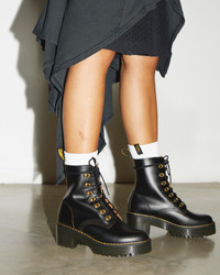 The Leona is packed with rugged features: a commando tread, an extra-empowering platform sole with a chunky heel, antiqued brass tunnel eyelets and a sleek silhouette. The result? A women's boot that strikes the perfect balance between femininity and the tough, rebellious Dr. Martens spirit. - Made with Vintage Smooth, a retro version of our signature smooth leather with subtle grained effect and contrast base color - Built on the rebelliously comfortable Dr. Martens Airwair™ air-cushioned sole - Sole is slip-resistant with superior abrasion, and is oil and fat resistant, too - Classic Doc's DNA is in full effect, with visible stitching, grooved sides and a scripted heel-loop - Platform height: 1 1/8 in; Heel height: 2 1/4 in Material A retro version of our signature smooth leather with subtle grained effect and contrast base color. Construction Cemented - the sole is cemented to the upper, durable and flexible for all day comfort. Product code 22601001