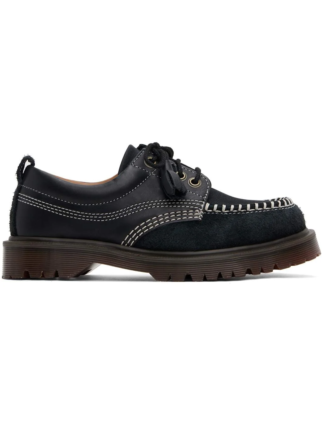 Buffed leather, nubuck, and suede derbys in black. · Blanket stitching at moc toe · Tassels at lace-up closure · Padded collar · Pull-loop at heel collar · Buffed leather and suede lining · Serrated detailing at heat-sealed Goodyear welt · Treaded Air Cushion rubber sole · Contrast stitching in white Supplier color: Black kinsley tumble Upper: leather. Sole: rubber. Made in Thailand 252399F120006