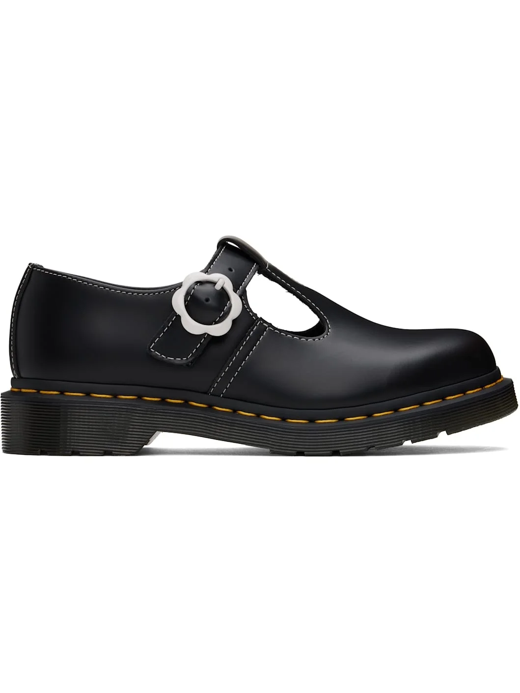 Buffed leather Mary Jane-style loafers in black. · Pin-buckle strap with graphic hardware at vamp · Buffed leather lining · Yellow topstitching at heat-sealed Goodyear welt · Treaded Air Cushion rubber sole · Contrast stitching in white · Heel: H1.25" Supplier color: Black Upper: leather. Sole: rubber. Made in Viet Nam 251399F120033
