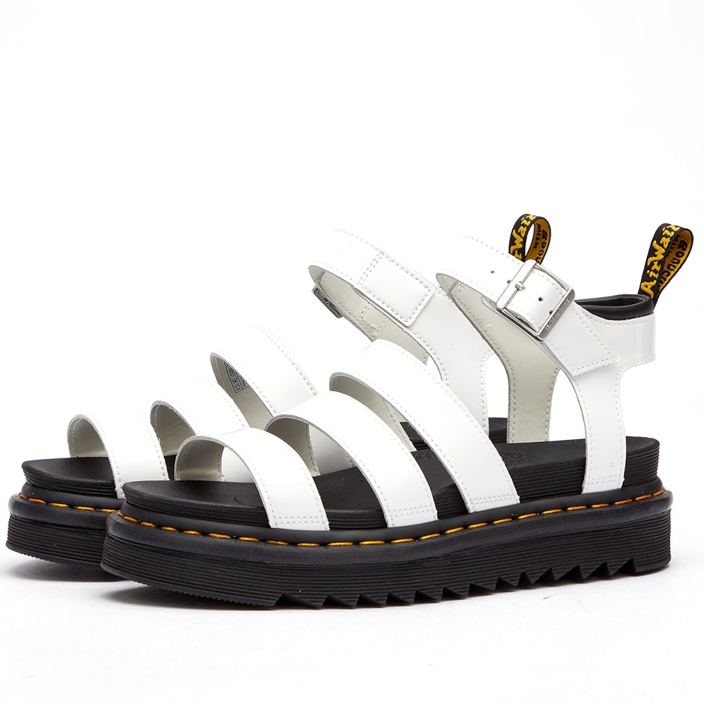 Dr. Martens revamps the Blaire this season, with its lightest sole yet. The gladiator sandals ensure that you steal the scene, with three smooth leather straps coated with a matt finish. Classic DNA remains, with yellow stitch and a ridged sole, with the addition of a wedge for extra height and a padded collar for all-day comfort. - PU Coated Leather Uppers - Heel Pulls - Adjustable Buckle Strap Closure - Rubber Outsole