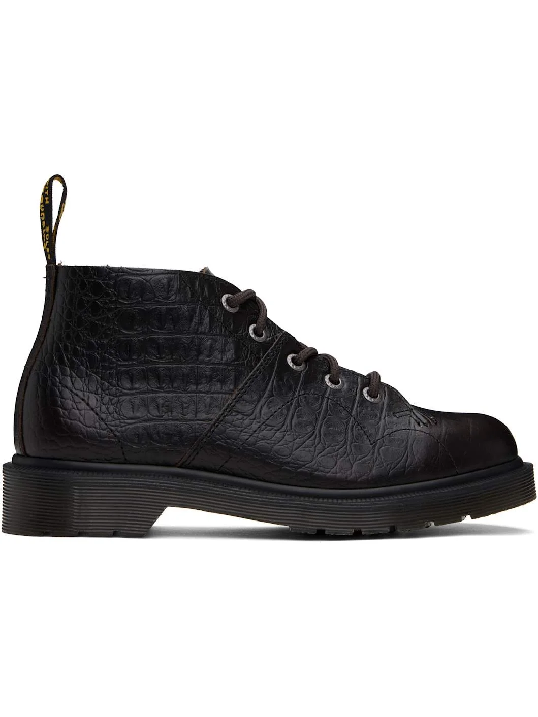 Ankle-high wax-coated and croc-embossed leather boots in brown. · Lace-up closure · Text-woven pull-loop at heel collar · Suede lining · Serrated detailing at heat-sealed Goodyear welt · Treaded Air Cushion rubber sole Supplier color: Dark brown Upper: leather. Sole: rubber. Made in Thailand 252399F113001