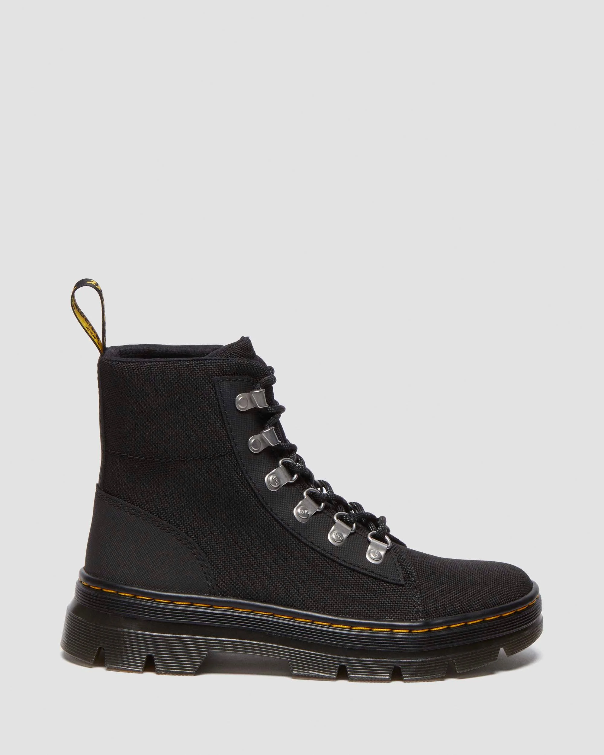 Tough enough for anything. Comfortable enough for every day. These boots are the ultimate in all-weather utilitarian footwear. Built from a mix of tough-yet-light poly and Ajax leather, the 6-tie boots are decked out with tonal D-rings and hiker hooks alongside our signature markings. - Ajax is a PU-coated split leather with a subtle geometric emboss - Extra Tough Poly is an extra tough, synthetic woven fabric with exceptional strength and elasticity - Utility-inspired — with DM’s attitude. Our relaxed Tract outsole is tough and light, with pavement-ready durable cemented construction and deep indentations for improved traction - Construction - Made with a comfortable, durable cemented construction - Footbed - Wider and a more rounded toe shape Material Ajax + Extra Tough Poly - a PU-coated split leather with a subtle geometric emboss, paired with an extra tough, synthetic woven fabric with exceptional strength and elasticity. Construction Cemented - the sole is cemented to the upper, durable and flexible for all day comfort. Product code 31924001