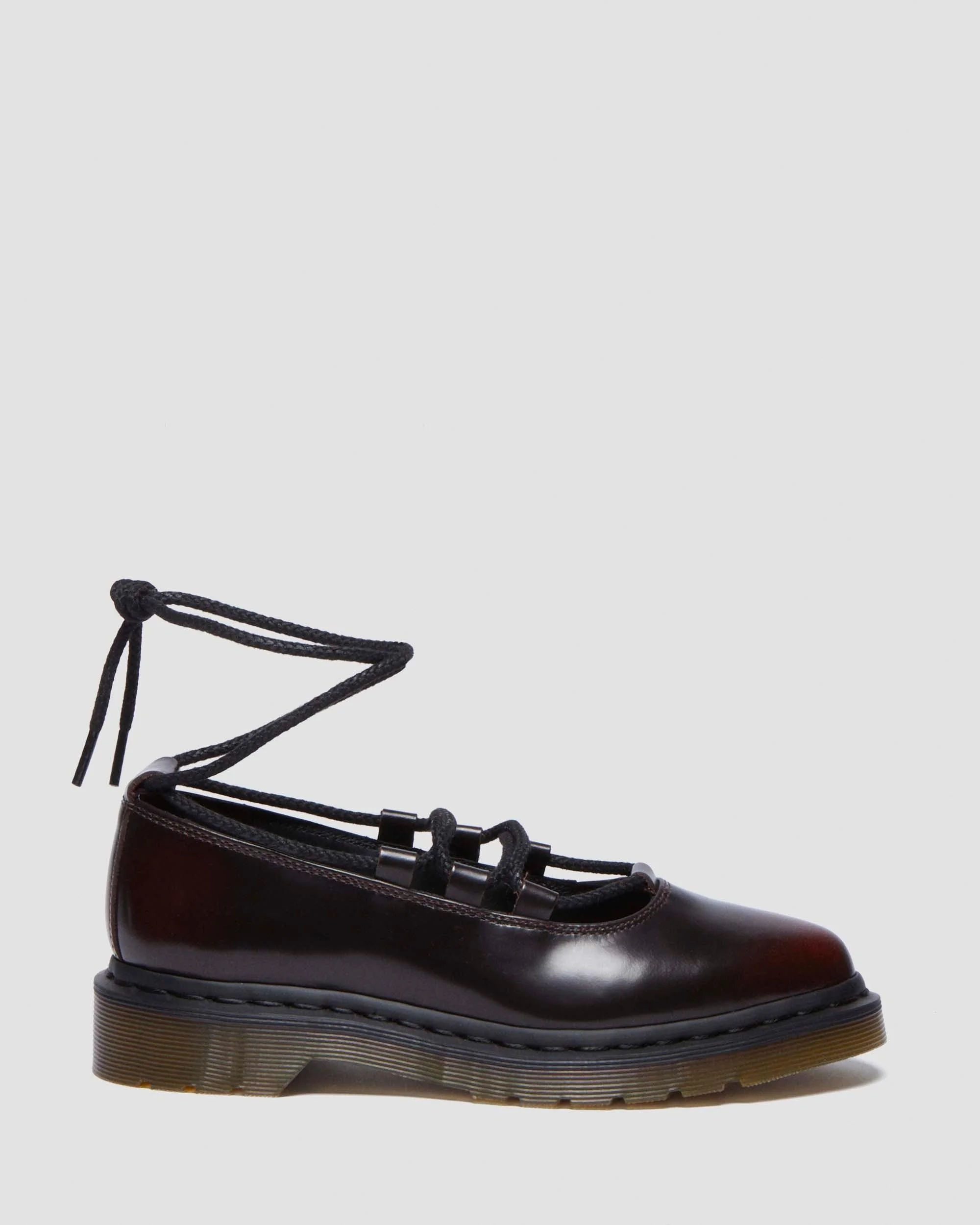 Get to the point. The Elphie ballet flat is our twist on a classic. Less dainty. More Docs. A pointed ballet flat shoe made from two-tone cherry red Arcadia leather, designed to shift in color over time. Fitted with wraparound laces, easily swapped out for a customized look. The tapered sole is marked with DM's signature grooving pattern and secured with black welt stitching. Material A high-shine leather with a base dye and contrasting topcoat, which is rubbed off to reveal the underlying color. Construction Goodyear Welted - the upper and sole are heat-sealed and sewn together, providing more comfort and durability for years to come. Product code 41094600