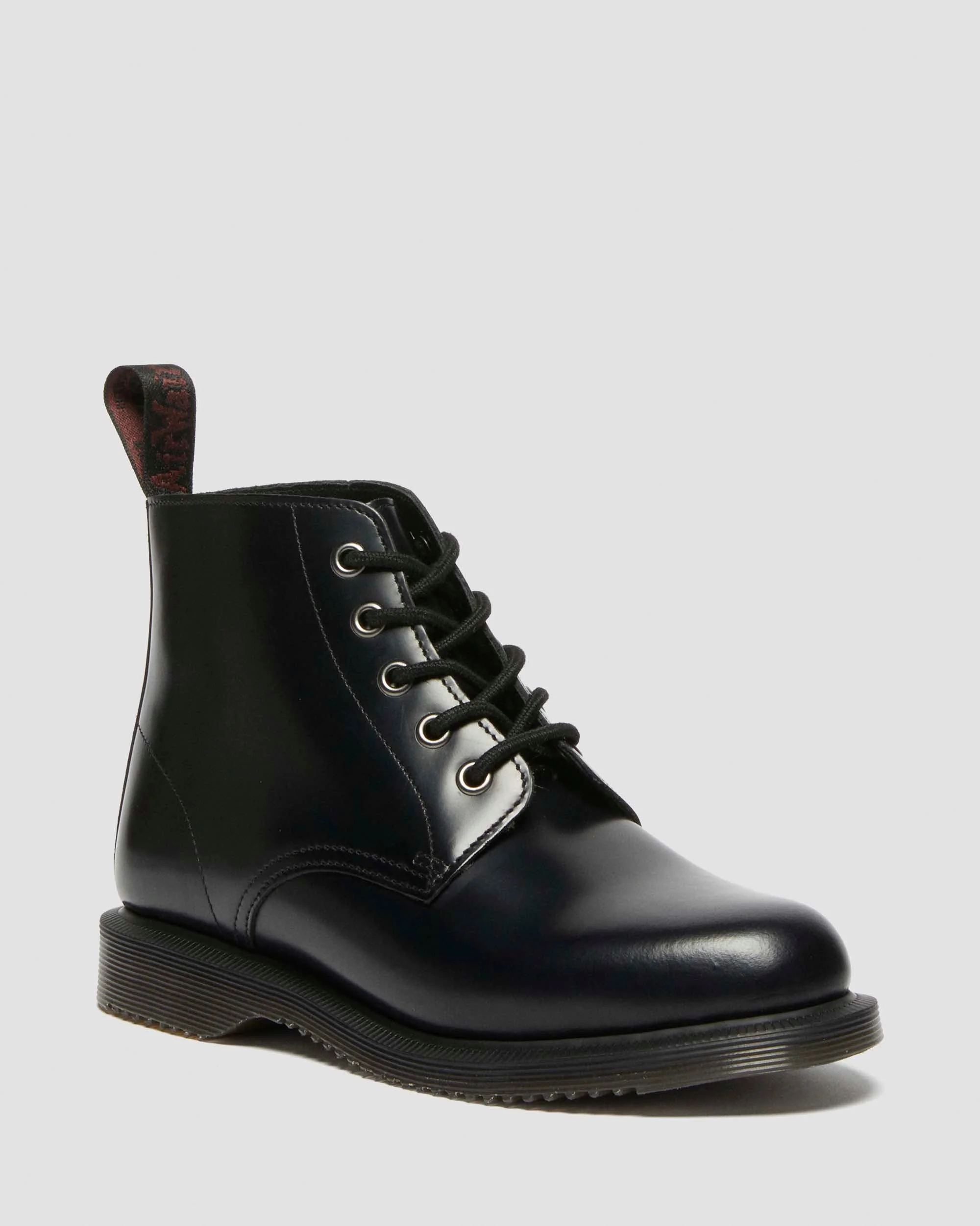 The Emmeline is a sleek 5-eye boot with a tapered toe shape. It is built from black Polished Smooth leather and punched with silver eyelets. It stands on a low-profile grooved sole secured with a plain welt for a sleek, minimalist finish. The top of the boot is tagged with a black heel loop signed in a subtle red script. - Polished Smooth is the original Dr. Martens leather: super durable, with a smooth finish polished to a high shine. Clean with a damp cloth and care with Dr. Martens Shoe Polish - Our Goodyear-welted lines are heat-sealed and reinforced with our signature welt stitch. Material A twist on the classic Dr. Martens leather: durable, with a smooth and polished finish.For tips on how to break in your Docs visit our Guide." Construction Goodyear Welted - the upper and sole are heat-sealed and sewn together, providing more comfort and durability for years to come. Product code 32219001
