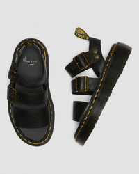 We've reinvented our headlining Gryphon sandal for the new season. Now standing on a high-rise Quad sole, the Gryphon Quad is manufactured from soft Pisa leather with rugged brass hardware. Welted, well-engineered and packed with Docs DNA — the sandals are finished with yellow welt stitching and an AirWair heel loop. - Pisa is a medium-weight milled Nappa leather with a soft tumbled handle and richly pigmented waxy finish - Construction - Made with our Goodyear-welted lines are heat-sealed at 700˚C and reinforced with our signature welt stitch - Platform height: 1 5/8 in Heel height: 2 in - Footbed - Slimmer and a more tapered toe shape Material Pisa - a medium-weight milled nappa leather with a super-soft tumbled handle and richly pigmented waxy finish. Construction Goodyear Welted - the upper and sole are heat-sealed and sewn together, providing more comfort and durability for years to come. Product code 25720001