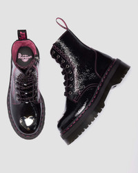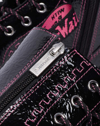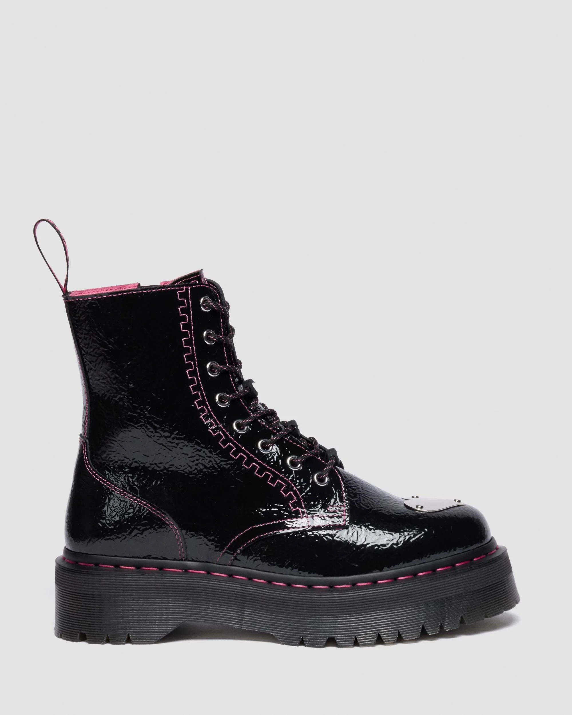 Taller, bolder, and full of personality. The Jadon 8-eye boot amps up the classic 8-eye with a playful twist. Wrapped in black distressed patent leather, it’s supple and ready to shape to your every step. Black-and-pink cord laces, silver hardware, and pink stitching from welt to eyelets highlight the design, while the pink suede lining keeps it comfy inside. Grounded on a grooved Quad platform sole with a pink welt stitch and finished with our black-and-pink heel loop and silver heart toe plate. A boot that’s tough and impossible to ignore. Material Distressed Patent - A PU-Coated leather with a brilliant shine. Construction Goodyear Welted - the upper and sole are heat-sealed and sewn together, providing more comfort and durability for years to come. Product code 42099001