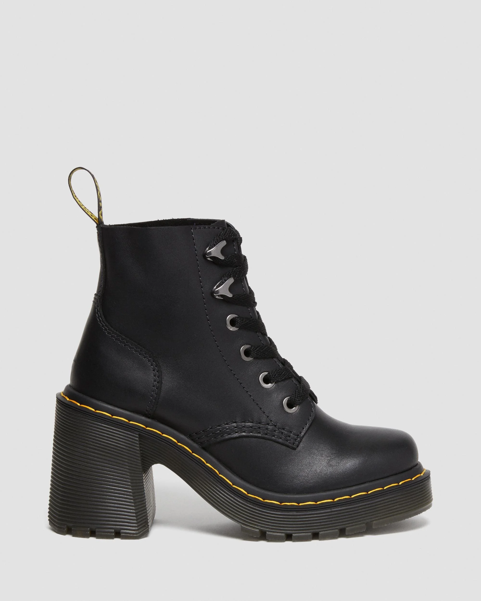 The Jesy. A maximum impact 6-eye boot. Constructed from smooth, full-grain Sendal leather on our towering 3 3/4 inch Arden flared heel. Completed with an external heel counter, arrow-shaped ski hooks, gunmetal eyelets and an unmistakable yellow Goodyear welt-stitch. Signed with our scripted heel loop. - Sendal is a semi-aniline, natural-looking nappa leather with a smooth full-grain finish - Construction - Made with our Goodyear-welted lines that are heat-sealed at 700˚C and reinforced with our signature welt stitch - Sole Height - Platform height: 1 1/8 in; Heel height: 3 3/4 in - Standard last - Recommended for all feet, but perfect for average to wide width feet Material This semi-Aniline, natural-look Nappa Leather features a smooth full-grain finish. Construction Goodyear Welted - the upper and sole are heat-sealed and sewn together, providing more comfort and durability for years to come. Product code 27613001