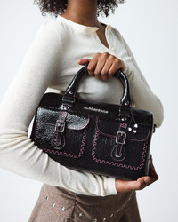 Carry some attitude. Our Top Handle bag brings bold DM’s energy to your everyday. Crafted in black distressed Patent leather and detailed with contrasting pink embroidery. This statement piece keeps you organized with a spacious zipped main compartment and two buckle-fastened external pockets. Dual handles let you grab and go, while a removable crossbody strap gives you hands-free freedom. Silver hardware and classic DM’s accents make sure it stands out. Material Distressed Patent - A PU-Coated leather with a brilliant shine. Product code 42491001