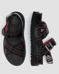 The Voss II sandal keeps your stride light and breezy. Updated in distressed black patent leather with pink stitching and pink welt stitch, this sandal adds a twist to classic DM’s style. Its cross-strap design with adjustable buckles keeps you secure, while the SoftWair foam footbed cushions every step. Sitting on our lightweight EVA Zebrilus sole with serrated grooving and pink welt stitching. Comfort you can count on. Material Distressed Patent - A PU-Coated leather with a brilliant shine. Construction Net Fit is a type of welted construction with a sole stuck on and heat sealed via the gasket Product code 42370001