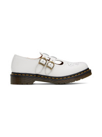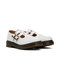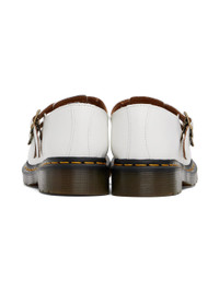 Buffed leather Mary Jane-style loafers in white. · Graphic perforated detailing at toe · Pin-buckle straps and cutouts at vamp · Buffed leather and twill lining · Logo printed at padded leather footbed · Yellow topstitching at heat-sealed Goodyear welt · Treaded AirWair rubber sole · Logo-engraved antiqued gold-tone hardware Supplier color: White