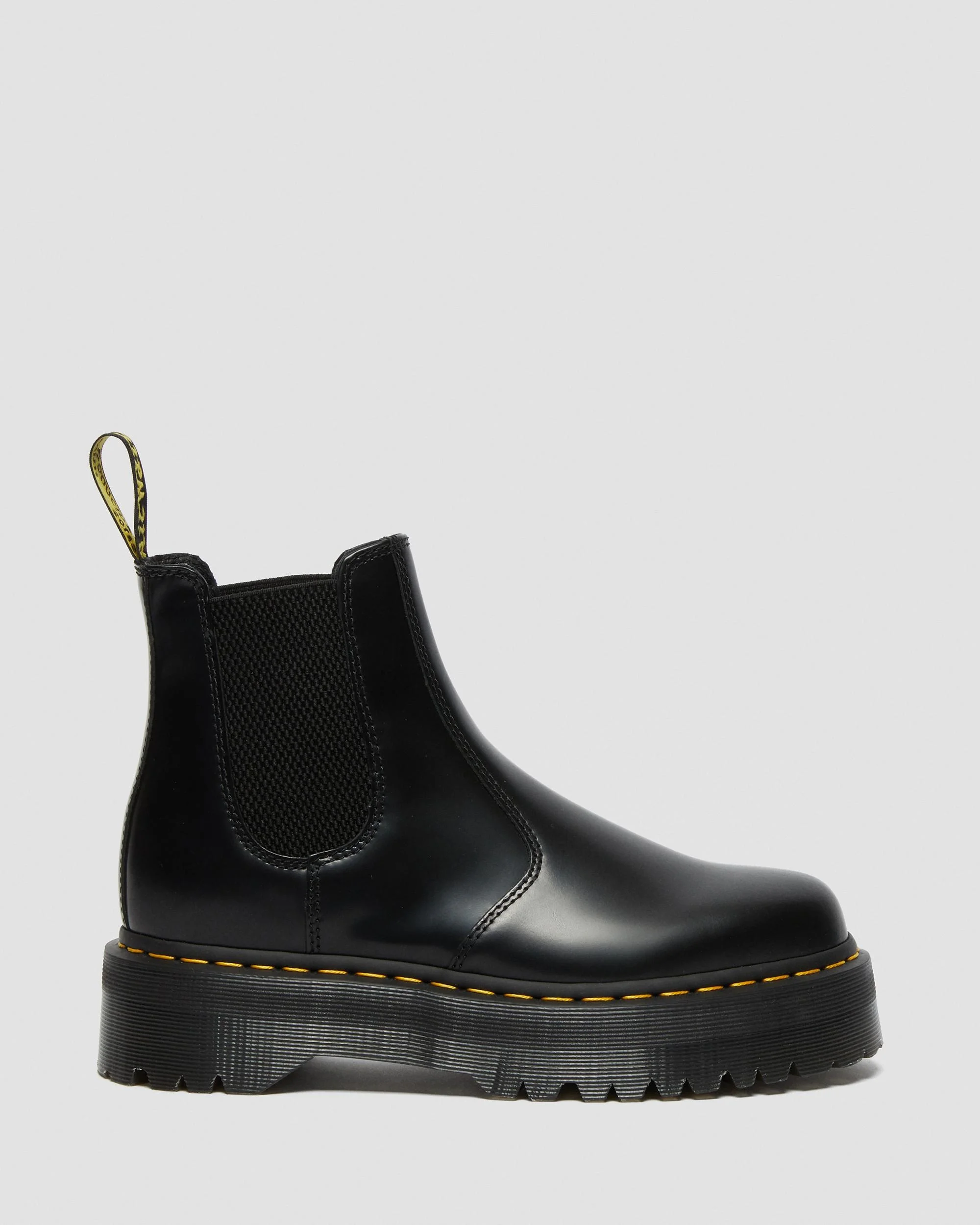 Get higher. Our 2976 Chelsea boot stands taller in Polished Smooth leather with a Quad platform sole. Classic DM’s touches appear from heel to toe, with yellow welt stitching, a grooved sole, and a black and yellow heel loop. Elasticated gussets make for easy-on, easy-off wear from day one. - Platform height: 1 1/2 in; Heel height: 1 7/8 in Material A twist on the classic Dr. Martens leather: durable, with a smooth and polished finish.For tips on how to break in your Docs visit our Guide." Construction Goodyear Welted - the upper and sole are heat-sealed and sewn together, providing more comfort and durability for years to come. Product code 24687001