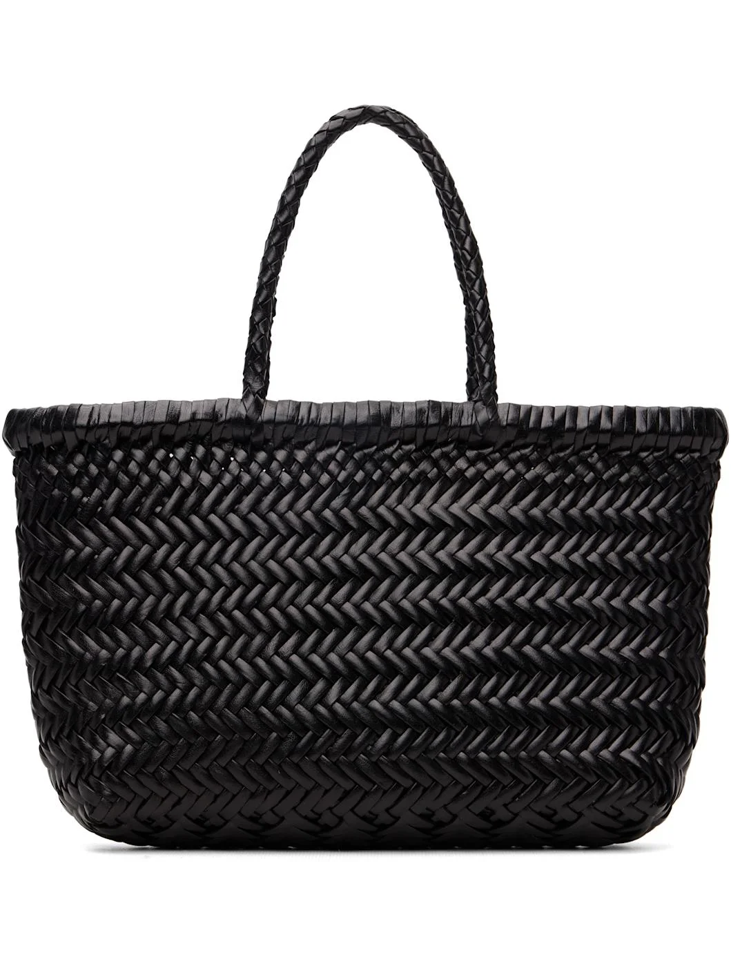 Hand-woven buffalo calfskin top handle bag. · Twin rolled carry handles · Open throat · Logo disc hand-sewn at interior · Unlined · H8.5" x W12" x D2" Supplier color: Black 100% buffalo calfskin. Made in India 261243F046006