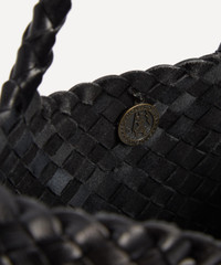 DETAILS Large tote bag Buffalo calfskin leather Hand-woven One main compartment Open top Two top handles Antiqued St. Christopher medal charm detail COMPOSITION & SIZE 100% Buffalo Calf Leather L: 23cm, W: 44cm, D: 14cm