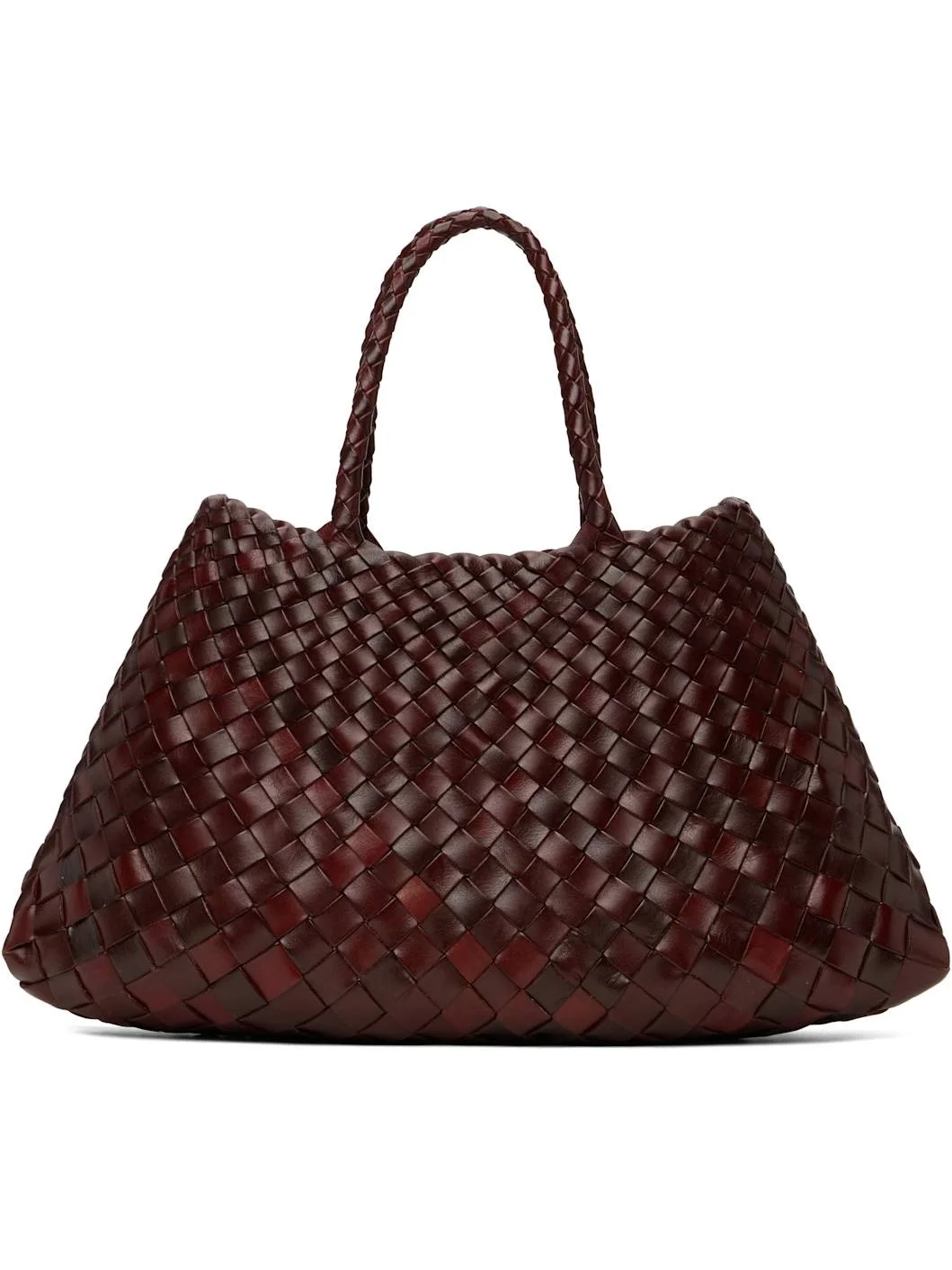 Handcrafted basket-woven buffalo calfskin tote in burgundy. · Twin rolled carry handles · Open throat · Logo disc hand-sewn at interior · Unlined · H6.5" x W16" x D4.5" · Total height: H14" Supplier color: Bordo Buffalo calfskin. Made in India 251243F049019
