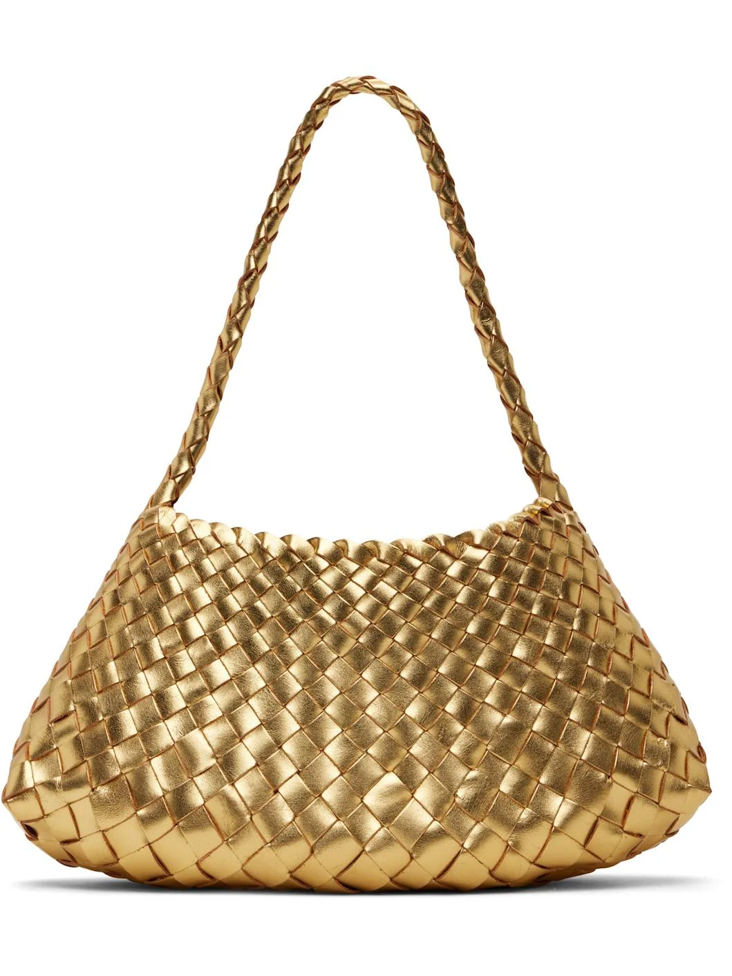 Handcrafted basket-woven buffed leather shoulder bag. · Fixed shoulder strap · Open throat · Logo disc hand-sewn at interior · Unlined · H6.25" x W13" x D4" Supplier color: Gold 100% leather. Made in India 261243F048025