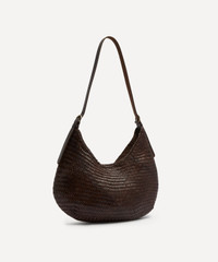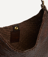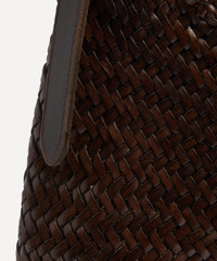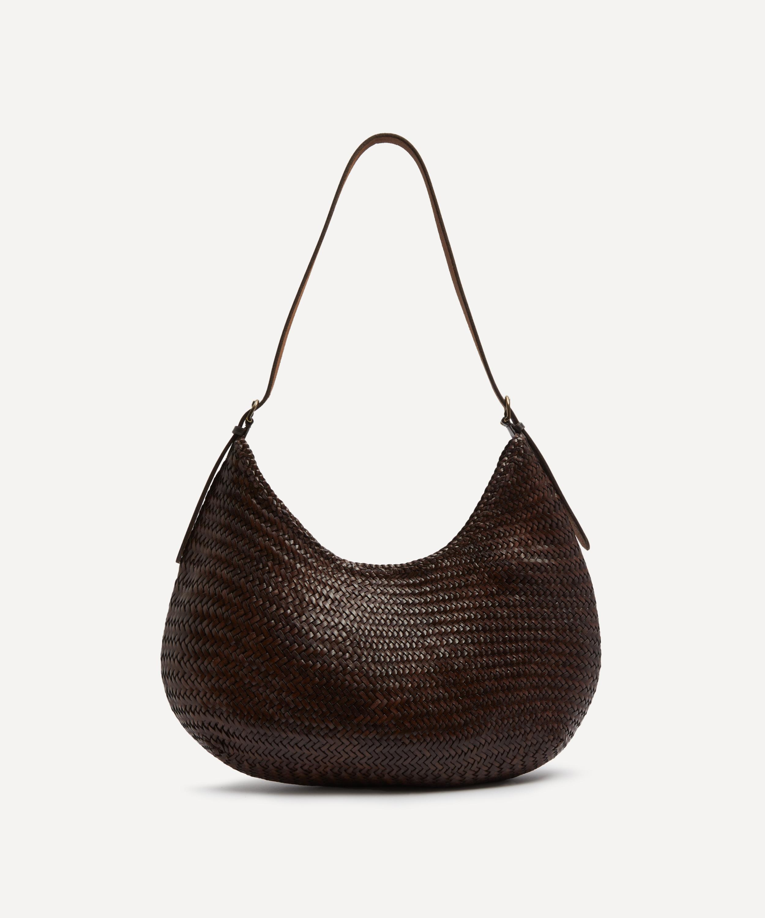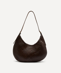 DETAILS Shoulder bag Buffalo calfskin leather Adjustable flat leather strap Round shape Unlined Handwoven Engraved Saint Christopher charm inside Care: Clean with a soft, dry cloth COMPOSITION & SIZE 100% Buffalo Calfskin Leather L: 37cm, W: 46cm