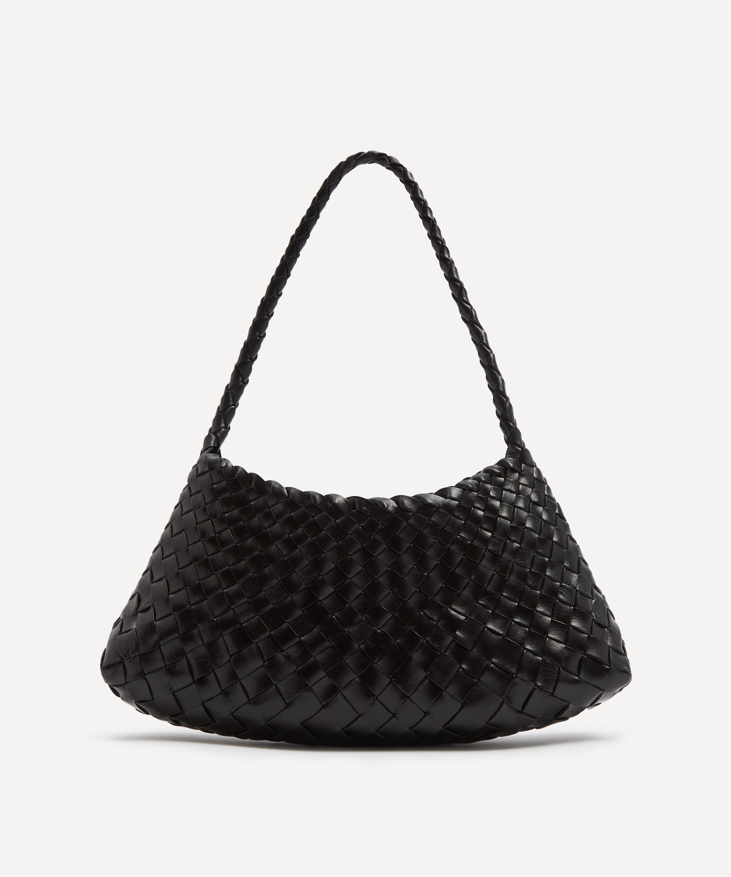 DETAILS Baguette bag Buffalo calfskin leather Woven strap Unlined Handwoven Engraved Saint Christopher charm inside Care: Clean with a soft, dry cloth COMPOSITION & SIZE 100% Buffalo Calfskin Leather L: 14cm, W (Top): 18cm, W (Bottom): 32cm Handle Drop: 20cm