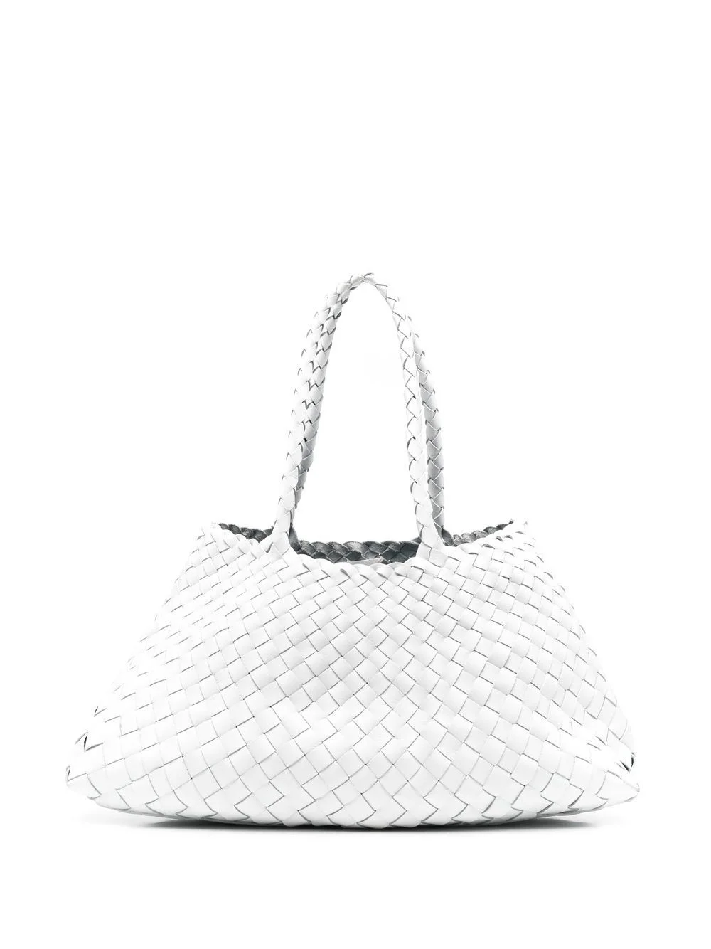 Santa Croce interwoven leather tote bag Santa Croce interwoven leather tote bag from DRAGON DIFFUSION featuring white, leather, interwoven design, two rounded top handles, trapeze body, magnetic fastening and main compartment. Imported Composition Outer: Leather 100% SIZE & FIT Model measurements Height 5 ft 11 in(1.8 m) Bust/Chest 31.49 in(80 cm) Hips 35.43 in(90 cm) Waist 24.4 in(62 cm) Measurement DEPTH 6.29 in(16 cm) HANDLE 7.28 in(18.5 cm) HEIGHT 8.66 in(22 cm) WIDTH 15.74 in(40 cm)