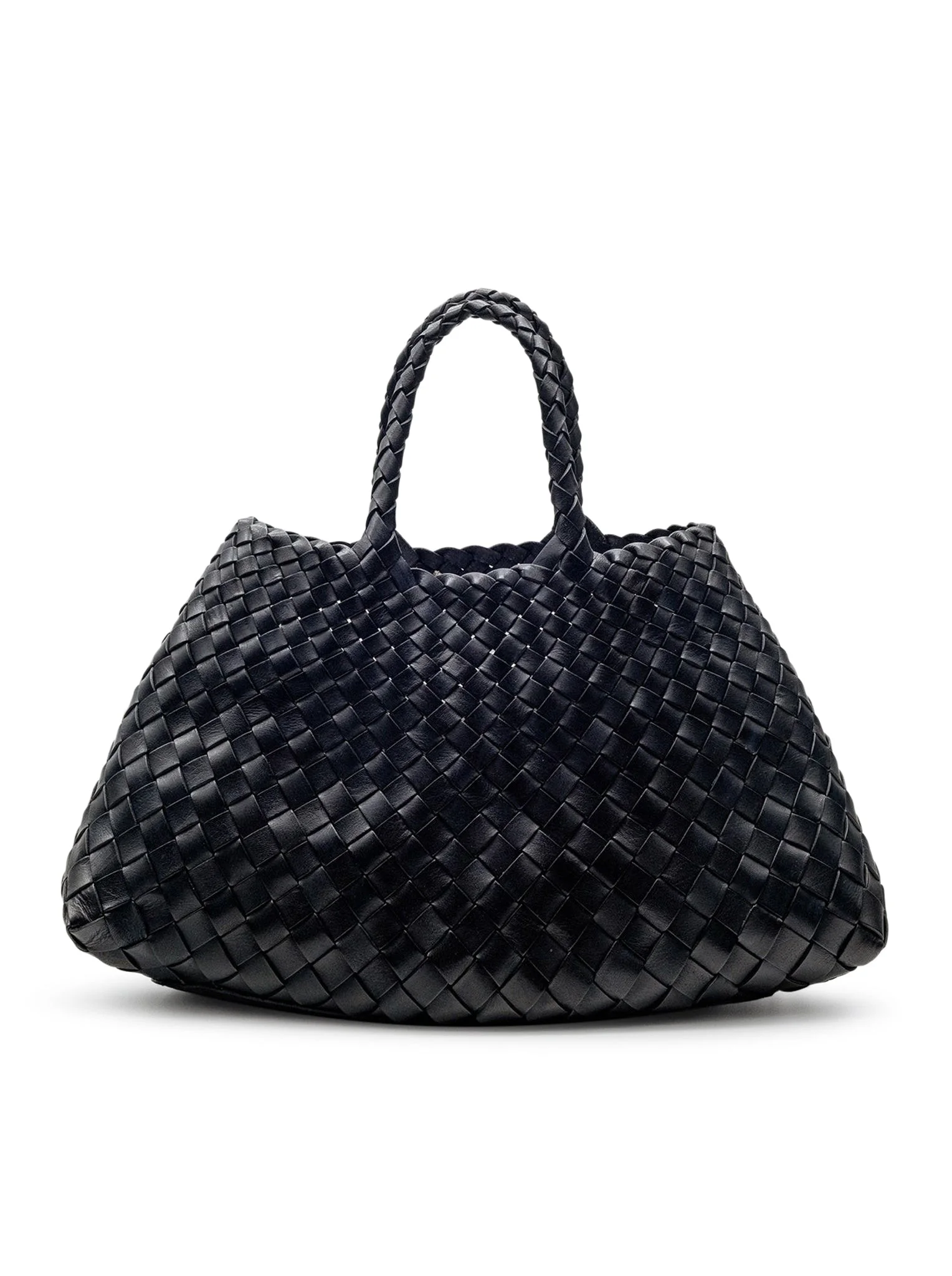-Handwoven basket, -Tapered buffalo calfskin, -Unlined -Top width: 17 cm -Bottom width: 38 cm -Length: 20 cm -Handle length: 16.5 cm Made in India Composition: Calf Leather 100% calf leather 33X20X13 CM Color code: BLACK DGW58893