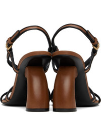 Buffed leather heeled sandals in tan and black. · Piping throughout · Open square toe · Crisscrossing straps at vamp · Pin-buckle slingback strap · Logo stamp at padded footbed · Covered sculptural heel with rubber injection · Polished leather sole · Heel: H3.5" Supplier color: Tan Upper: leather. Sole: leather, rubber. Made in Italy 251358F125000