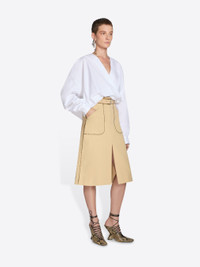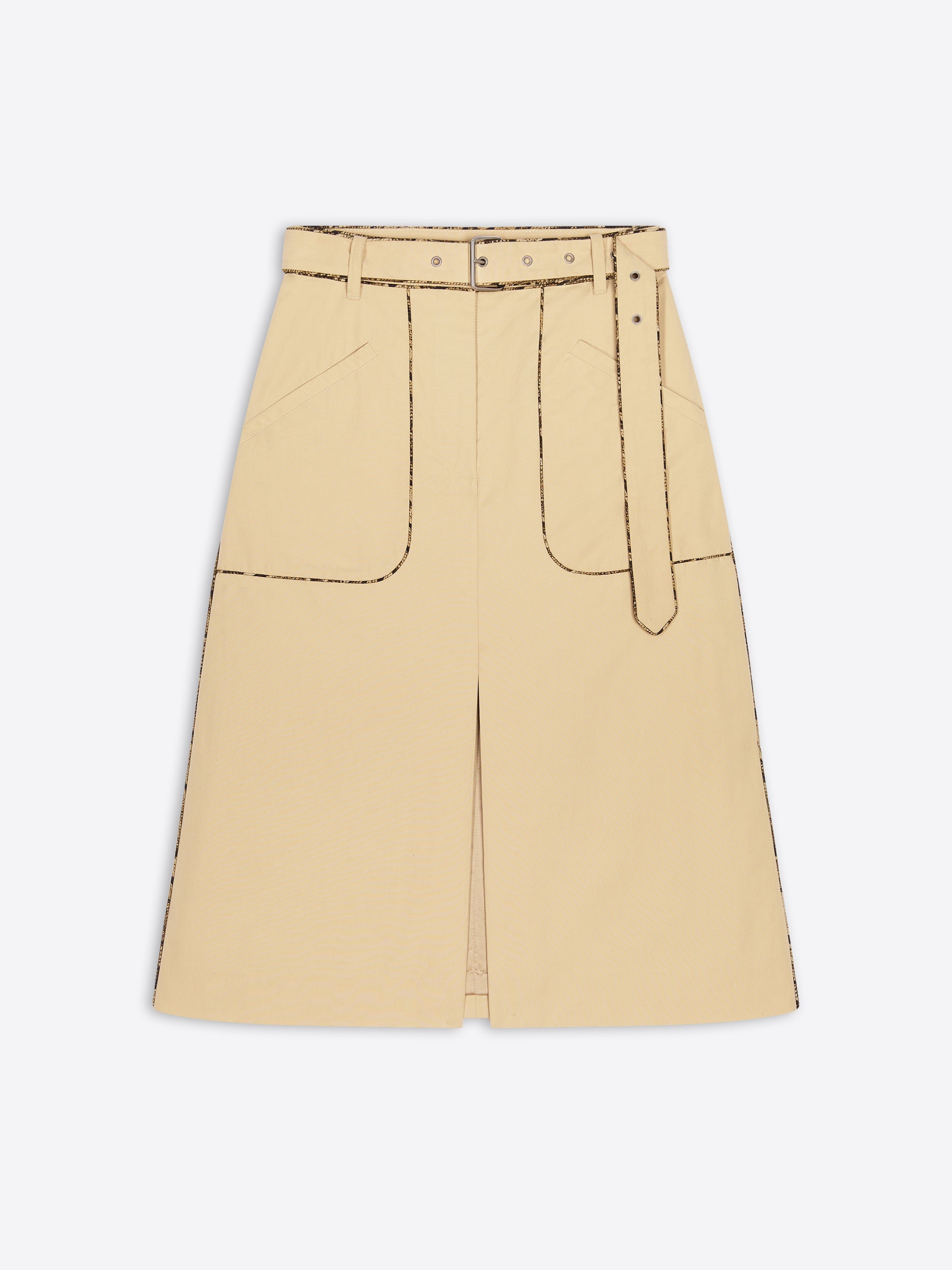 A-line knee length belted skirt in washed cotton polin, with front slit and patch pockets. DETAILS - 100% Cotton Poplin. Lining: 100% Viscose. - Printed jacquard python piping. - Regular fit. A-line. Knee length. Front slit. Side slit pockets. Belted. Front zip closure. - Ref: 251-010809-1449 SIZE AND FIT Model is 179 cm / 70.5 inches and wears size 34.