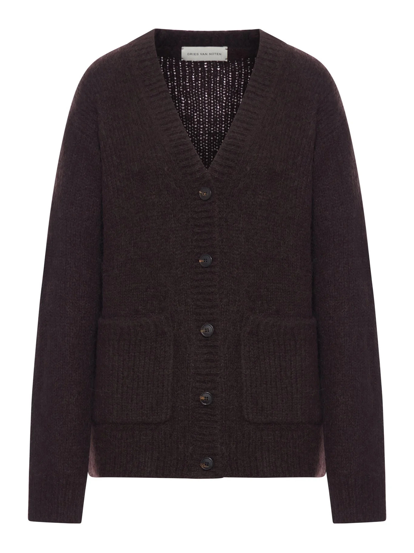 - V-neck - Front closure with mother-of-pearl buttons - Long sleeves - Two front patch pockets - Ribbed edges - Straight hem Made in China Composition: Alpaca 60% alpaca 25% We 15% Polyamide Color code: 704 DARK BROWN 2520112262709
