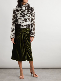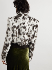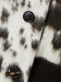 Bold prints and textures are key elements of Dries Van Noten's collections. Showcasing both, this cow-print jacket is made with wool and a touch of alpaca for a fluffy handle. It's defined by a stand collar with a double-breasted front and a ribbed hem. Details & Care - Cow-print wool-blend - Double-breasted fastenings through front - 51% wool, 19% polyester, 15% acrylic, 12% alpaca, 3% polyamide; buttons: 100% horn (Buffalo); lining: 100% viscose - Fully lined - Dry clean