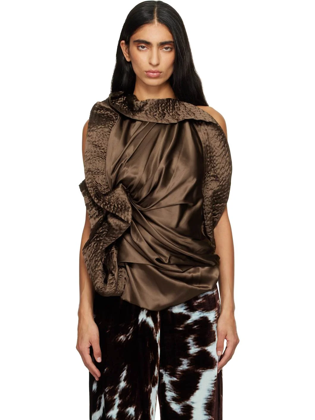 Stretch silk satin blouse. · Asymmetrical construction · Draping and quilted trim throughout · Self-tie halter neck fastening at side seam · Concealed zip closure at side seam Supplier color: Brown 94% silk, 6% elastane. Made in Poland 252358F107001