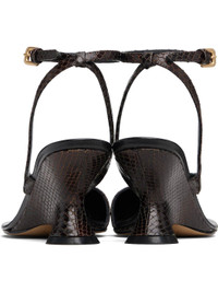 Snake-embossed leather heeled sandals. · Cutout at square toe · Pin-buckle ankle strap · Logo stamp at padded footbed · Covered wedge heel with rubber injection · Leather sole · Heel: H2.75" Supplier color: Dark brown Upper: leather. Sole: leather, rubber. Made in Italy 252358F125000