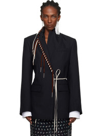Herringbone worsted wool blazer. · Whipstitched lacing at notched lapel · Elasticized self-ties at front · Welt pocket at chest · Flap pockets at waist · Buttoned surgeon's cuffs · Vents at back hem · Full satin lining Supplier color: Navy Body: 100% wool. Lining: 100% viscose. Made in India 252358F057003