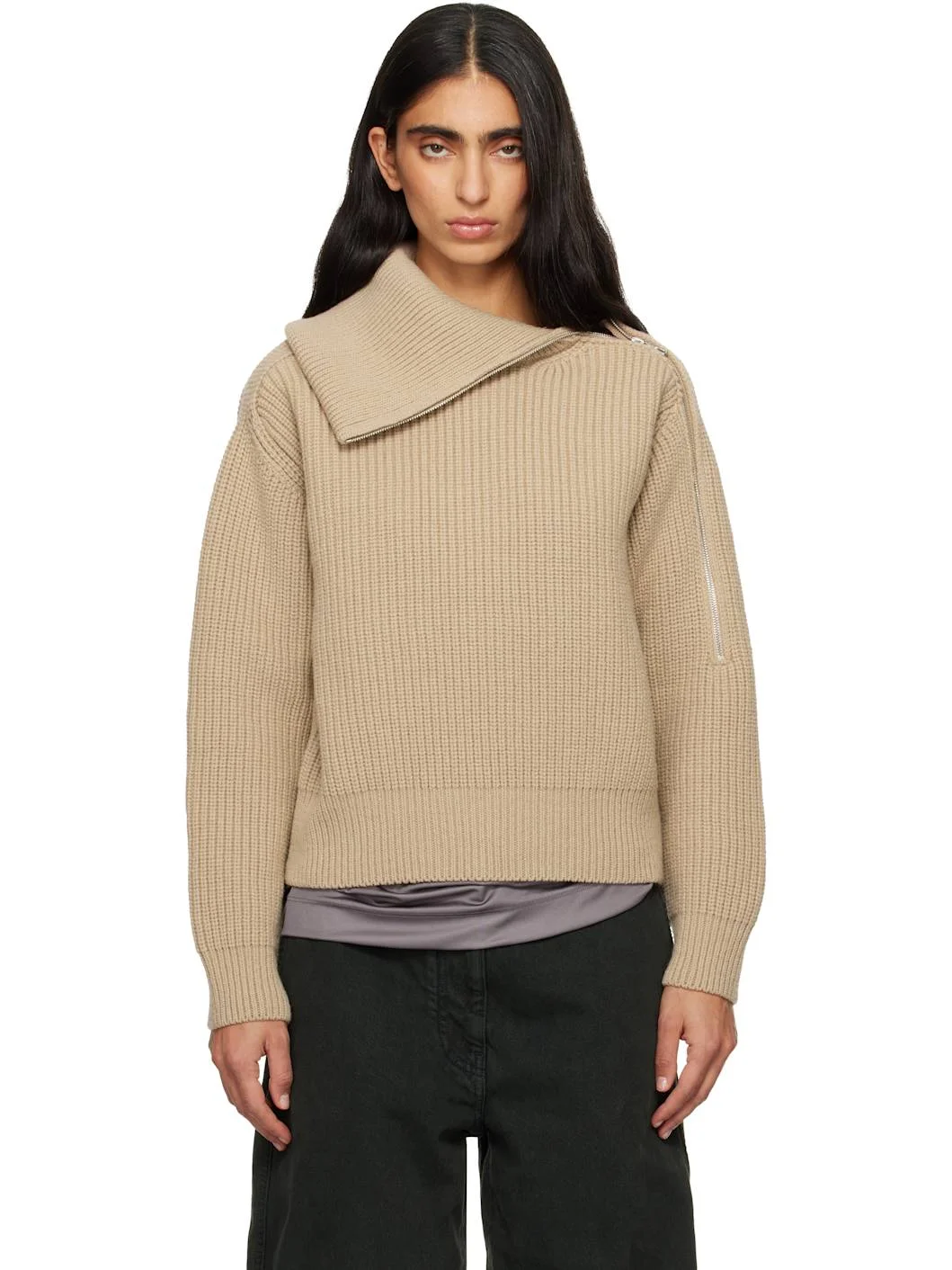 Rib-knit wool turtleneck. · Turtleneck converts to foldover neck · Offset zip closure · Dropped shoulders Supplier color: Beige 100% wool. Made in Belgium 252358F099010