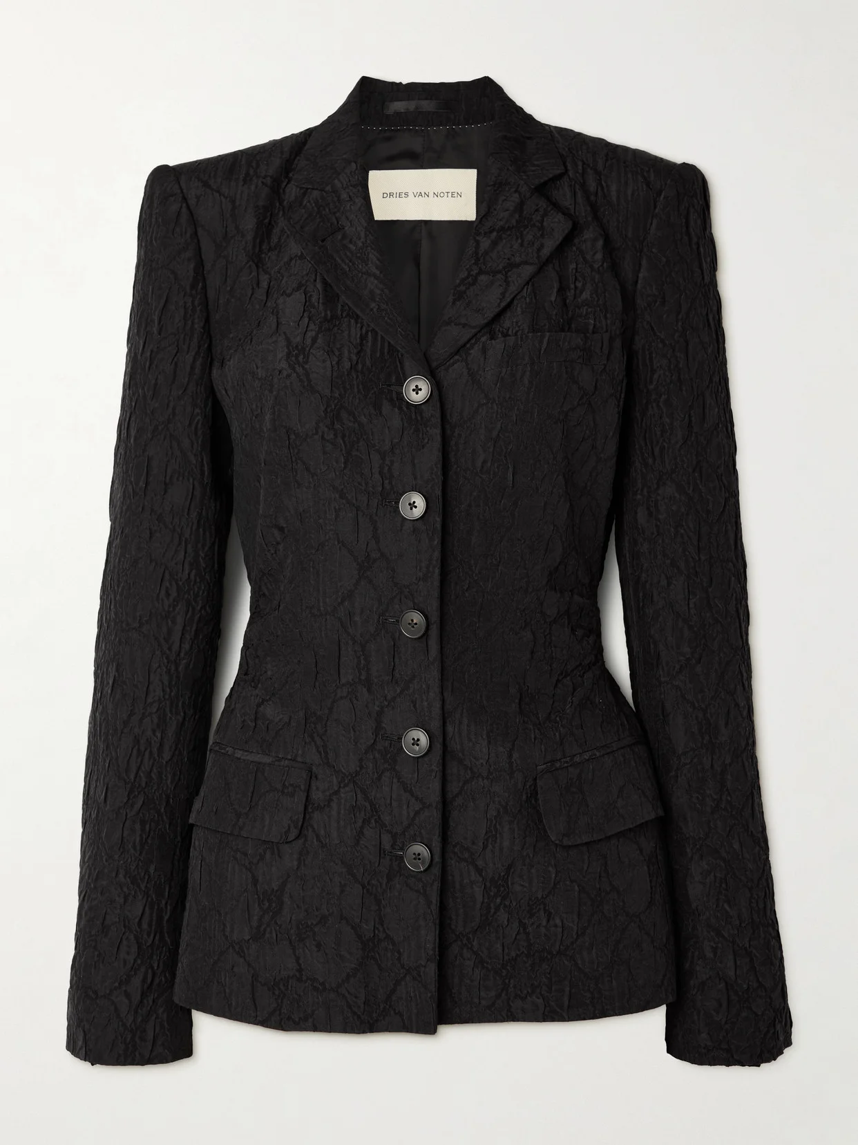 Beautifully classic, Dries Van Noten's blazer is tailored from black jacquard and has a crushed, textured finish. It has notched lapels framed by strong shoulders and features a belt at the reverse to help cinch in the waist.