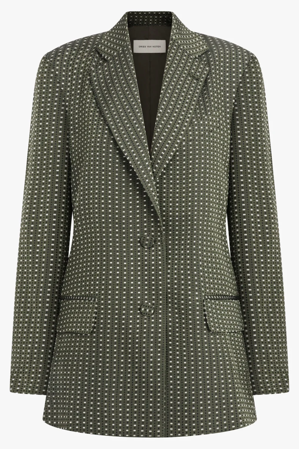 A modern tailoring essential, the Birdys Square Print Single Breast Jacket in Khaki by Dries Van Noten combines structured precision with subtle textural detail. Crafted in a 100% viscose square tie motif jacquard, the jacket features lightly padded shoulders that define a sharp silhouette, while the single-breasted front enhances a timeless, elegant shape. Finished with three-button cuffs, this jacket exudes refined craftsmanship and contemporary sophistication. - Fabrication: 100% Viscose - Square tie motif jacquard for textured, luxe appeal - Single-breasted design with clean, tailored lines - Lightly padded shoulders for structured silhouette - Three-button cuffs for polished, refined detail - Khaki hue for versatile, understated styling Style it with tailored trousers or a sleek midi skirt for a sophisticated, modern ensemble. Size and Fit Tiah: Model is 178cm/5’9” and is wearing a size 36 Model Measurements: Bust: 86cm, Waist: 69cm, Hips 90.5cm Form fitting, stretchy material. Recommended to take usual size. Measurements 36: Bust 96cm, Waist 96cm, Hip 96cm, Length 68cm 38: Bust 100cm, Waist 100cm, Hip 100cm, Length 68cm 40: Bust 104cm, Waist 104cm, Hip 104cm, Length 68cm