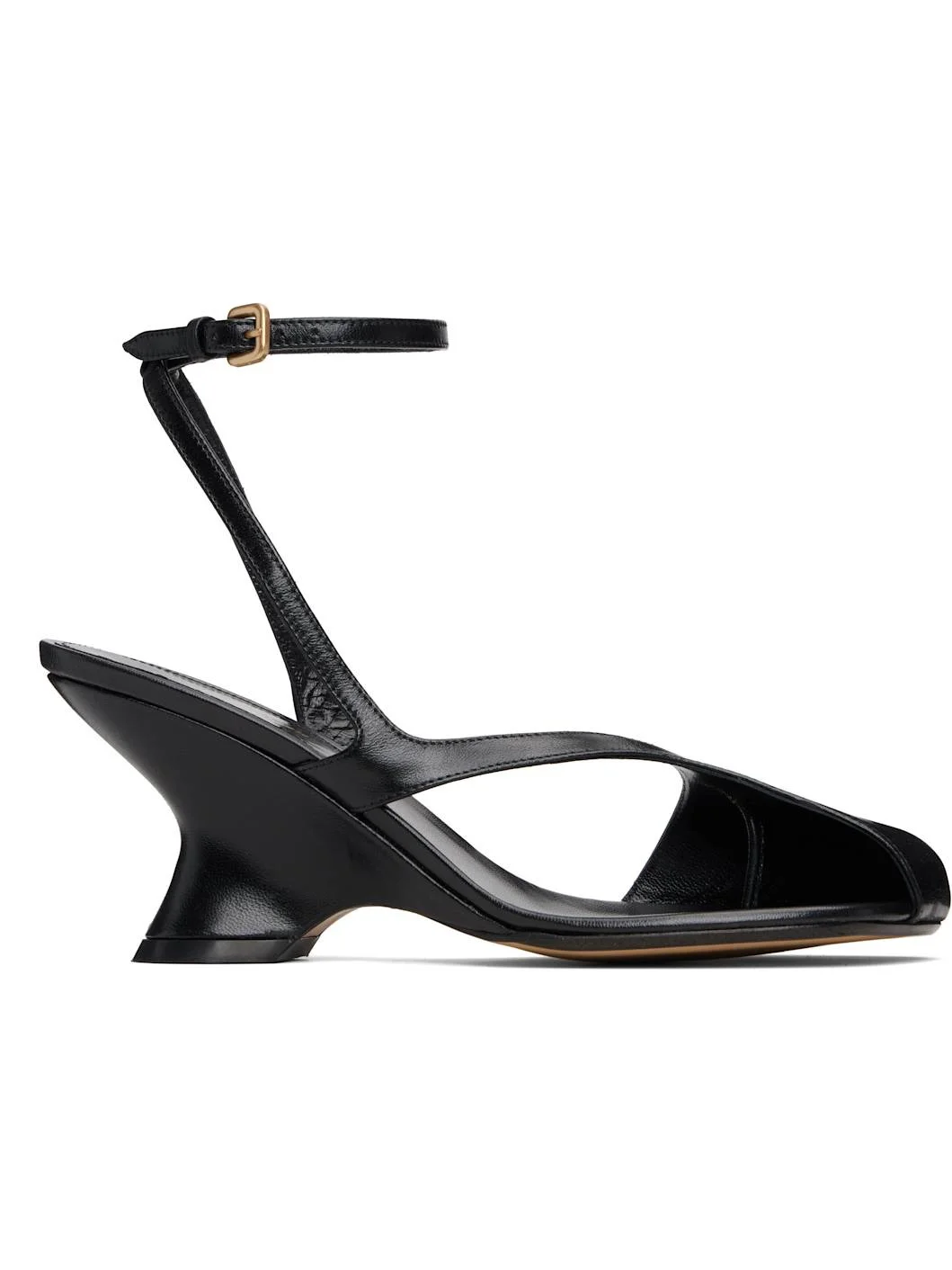 Buffed leather heeled sandals. · Cutout at square toe · Pin-buckle ankle strap · Logo stamp at padded footbed · Covered wedge heel with rubber injection · Leather sole · Heel: H2.75" Supplier color: Black Upper: leather. Sole: leather, rubber. Made in Italy 252358F125007