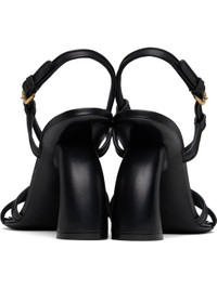 Buffed leather heeled sandals in black. · Open square toe · Crisscrossing straps at vamp · Pin-buckle slingback strap · Logo stamp at padded leather footbed · Covered sculptural heel with rubber injection · Leather sole · Heel: H3.5" Supplier color: Black Leather. Made in Italy 251358F125001