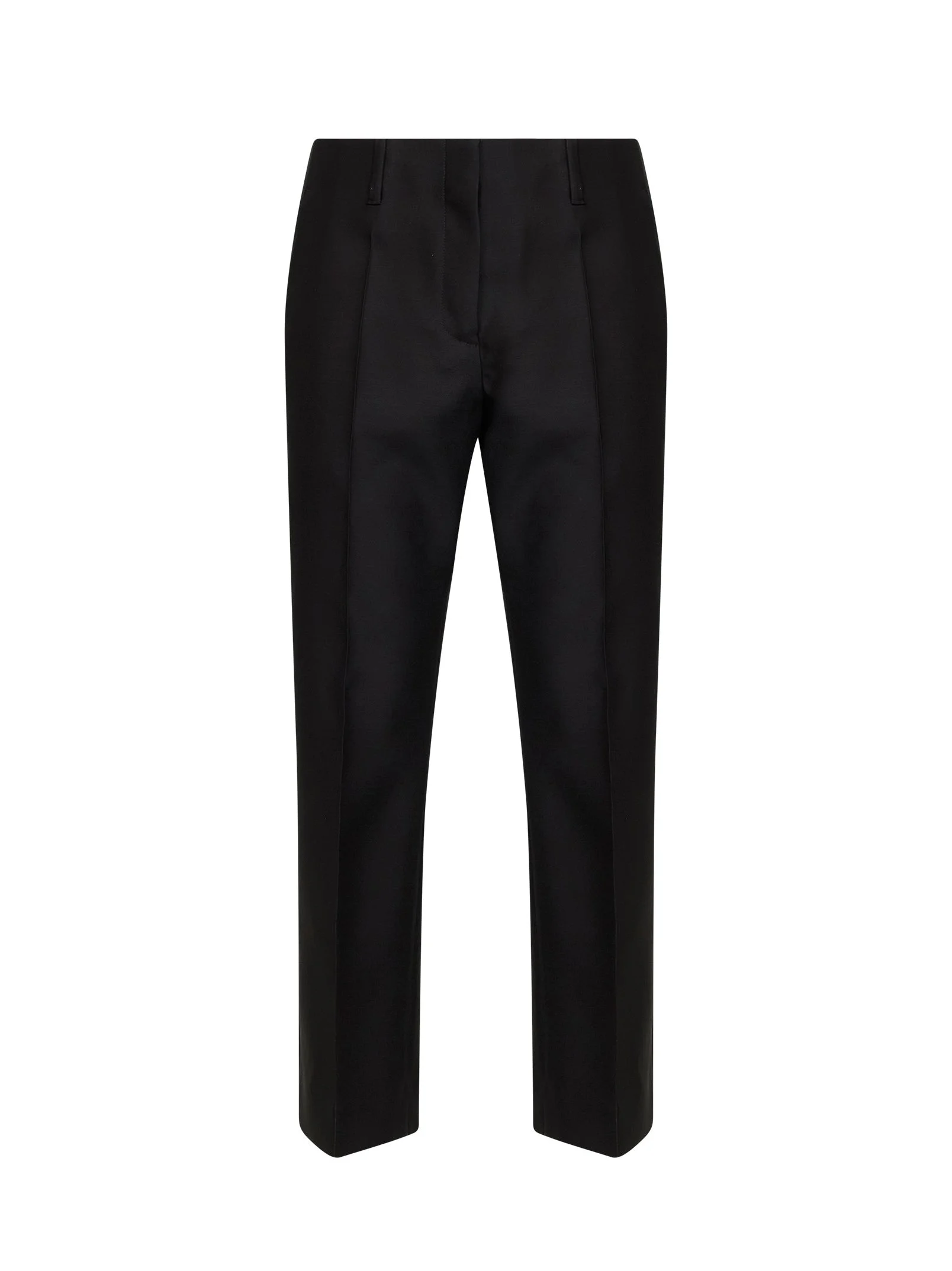 - Front zip-fly and hook closure - Waist with belt loops - Side pockets, back welt pockets - Flared bottom - Pintucked - Cropped cut - Fitted fit - Black color - 71% wool, 29% silk - Made in hungary Natural (Veg): Cotton57 % Synthetic: Acetate43 % Made in: Hungary Season: P26 0109183305900