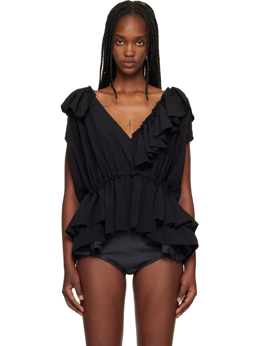 Chiffon blouse. · Gathering and ruffled trim throughout · Plunging V-neck · Drawstring at waist Supplier color: Black 100% polyester. Made in Bulgaria 261358F107015