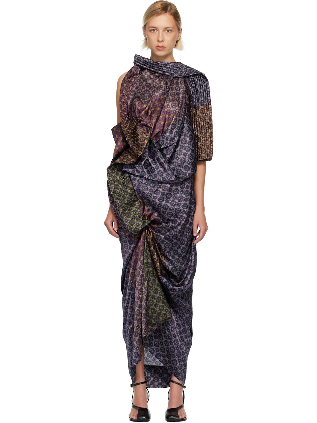 Twill maxi dress. · Stripes throughout · Button closure at scoop neck · Darts at chest · Dropped and asymmetrical waist · Gathering at skirt · Concealed zip closure at side seam · Fixed shoulder straps · Unlined Supplier color: Dessin 100% cupro. Made in Poland 252358F055009
