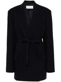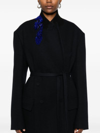 navy blue wool blend felted double-breasted button fastening bead detailing peak lapels long sleeves buttoned cuffs chest welt pocket two side flap pockets full lining straight hem Size & Fit Model Measurements: Height: 1.8 m Bust/Chest: 82.0 cm Hips: 91.0 cm Waist: 60.0 cm Model wears size S Fabric and Care Designer Style ID: 2420104269236 Designer Colour: 509 NAV NAVY Composition: Outer: Polyamide 10%, Wool 90%; Lining: Viscose 100% Washing instructions: Dry Clean Only Made in Morocco
