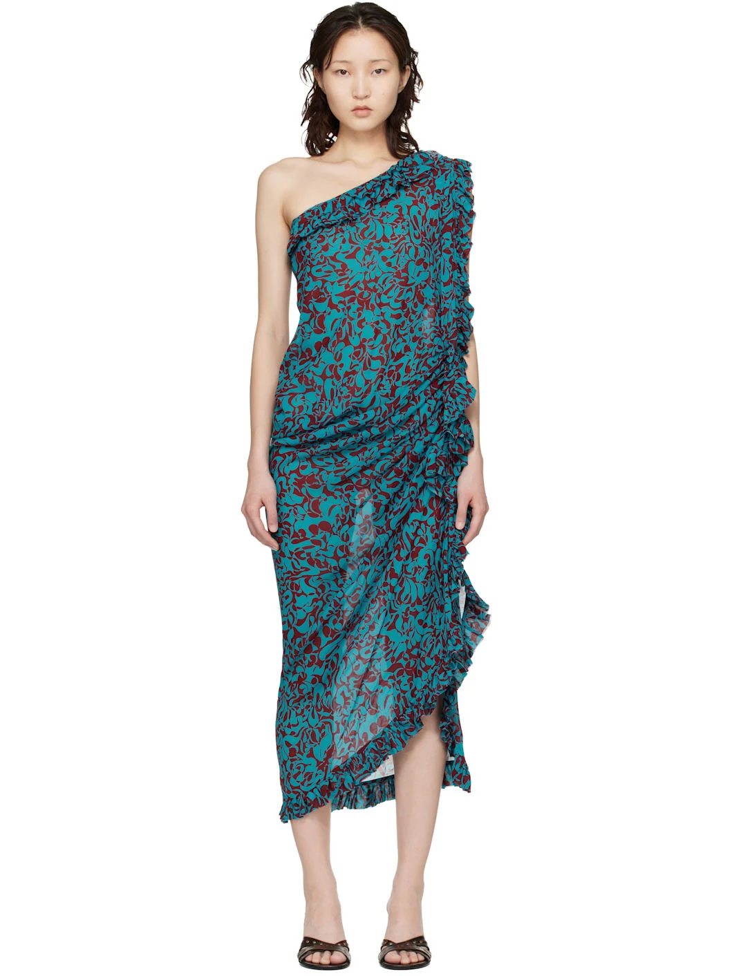 Viscose georgette midi dress. · Draping and graphic pattern throughout · Asymmetric single-shoulder construction · Ruffled trim at collar, hem, and side · Concealed zip closure at side · Unlined Supplier color: Turquoise 100% viscose. Made in Poland 261358F054004