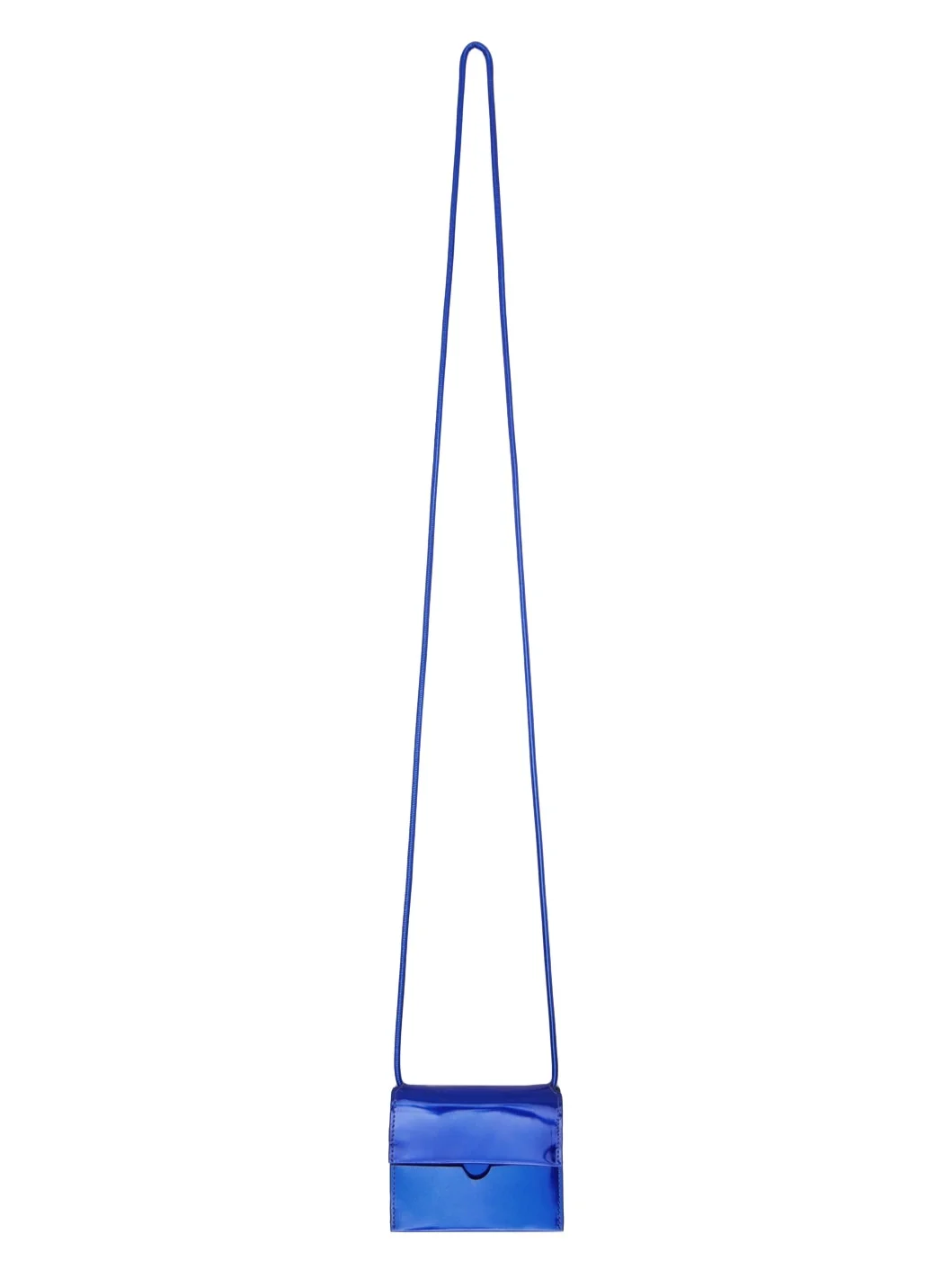 Patent leather card holder in metallic blue. · Detachable cord shoulder strap · Patch pocket at face · Logo embossed at back face · Foldover flap with press-stud closure · Card slot at two compartment interior · Grained leather interior in black · H3 x W4 x D1 in Supplier color: Blue