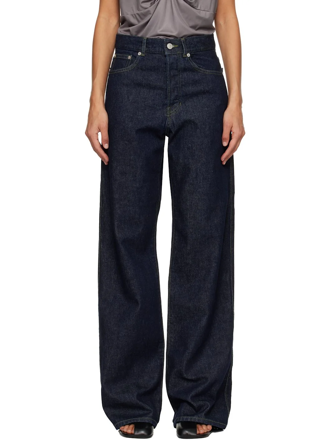 Non-stretch denim jeans. · Belt loops · Five-pocket styling · Button fly · Leather logo patch at back waistband · Logo-engraved silver-tone hardware · Contrast stitching in khaki Supplier color: Indigo 100% cotton. Made in Tunisia 252358F069004