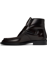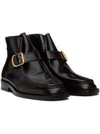 Ankle-high polished leather boots in brown. · Square moc toe · Pin-buckle strap at vamp · Bellows tongue · Buffed leather lining · Stacked leather heel with rubber injection · Leather sole Supplier color: Dark brown Upper: leather. Sole: leather, rubber. Made in Italy 242358F113002